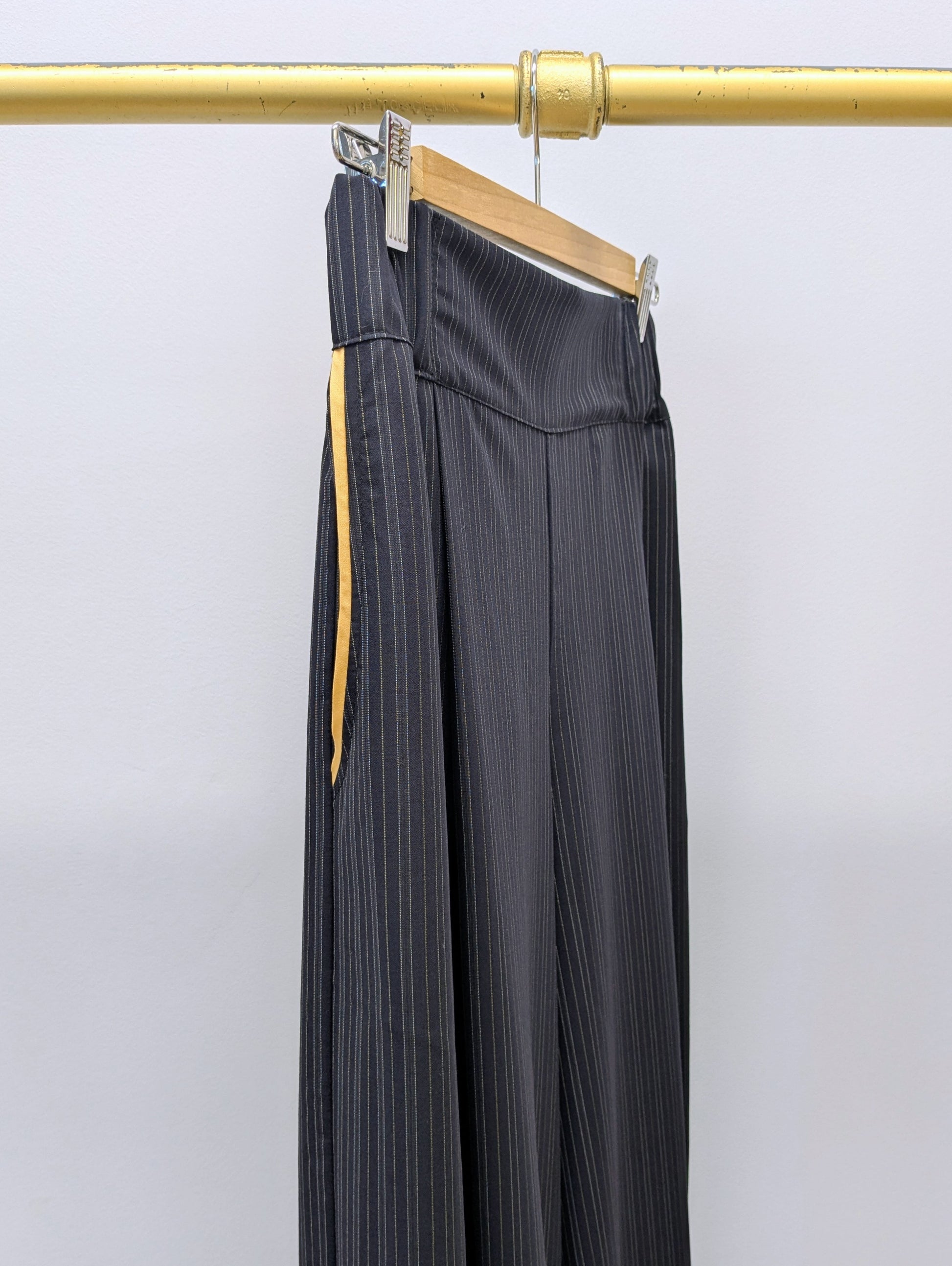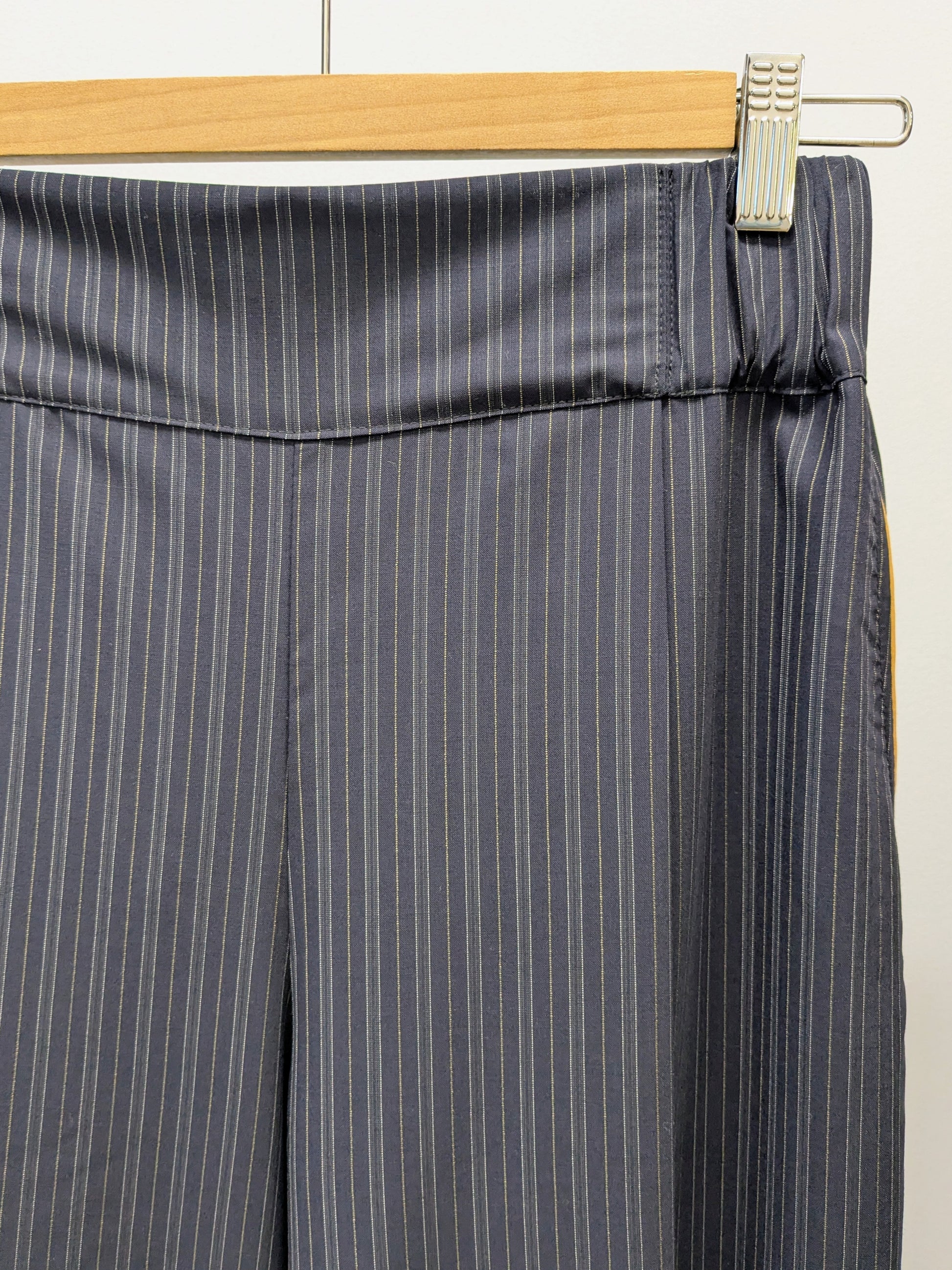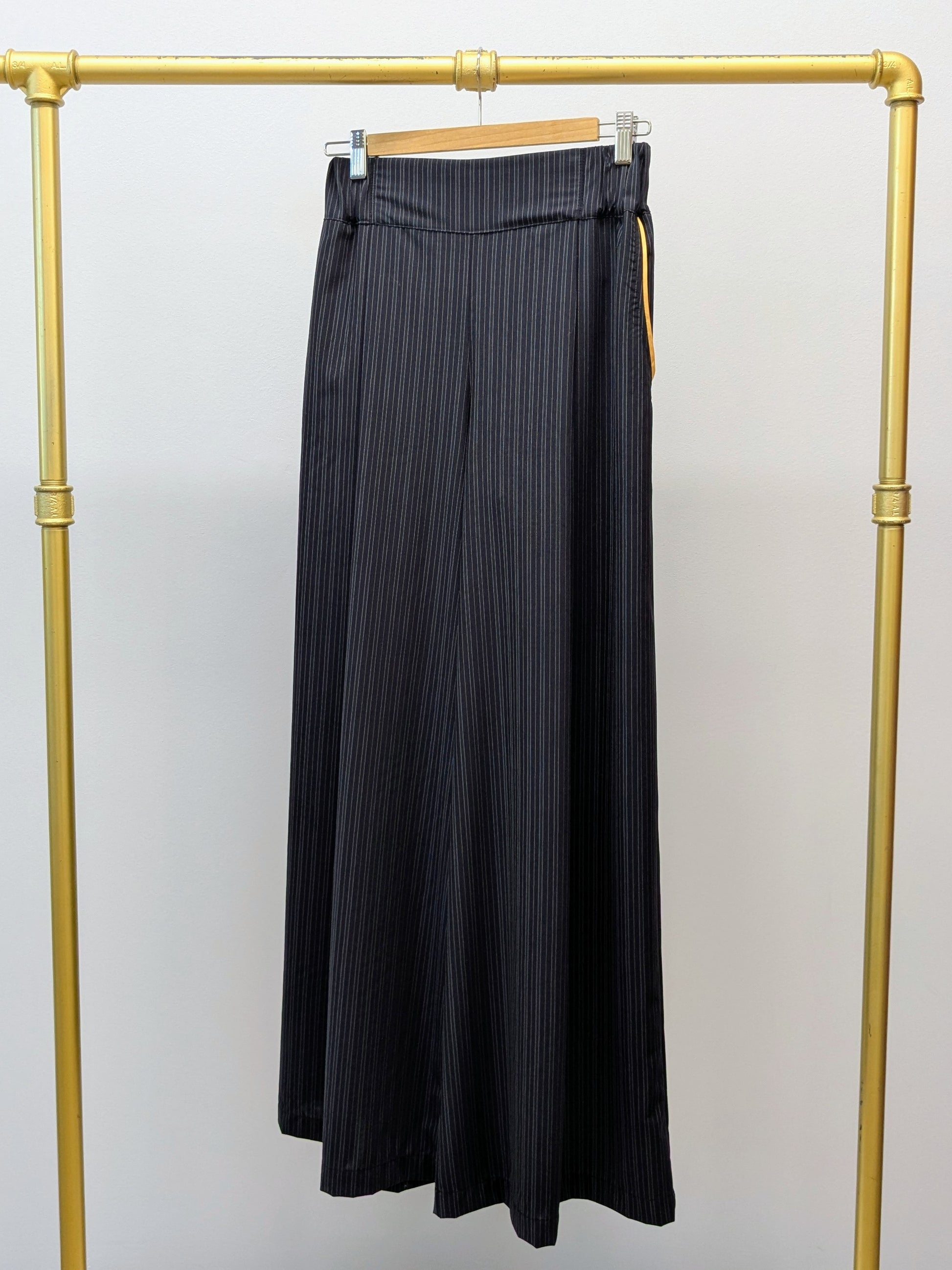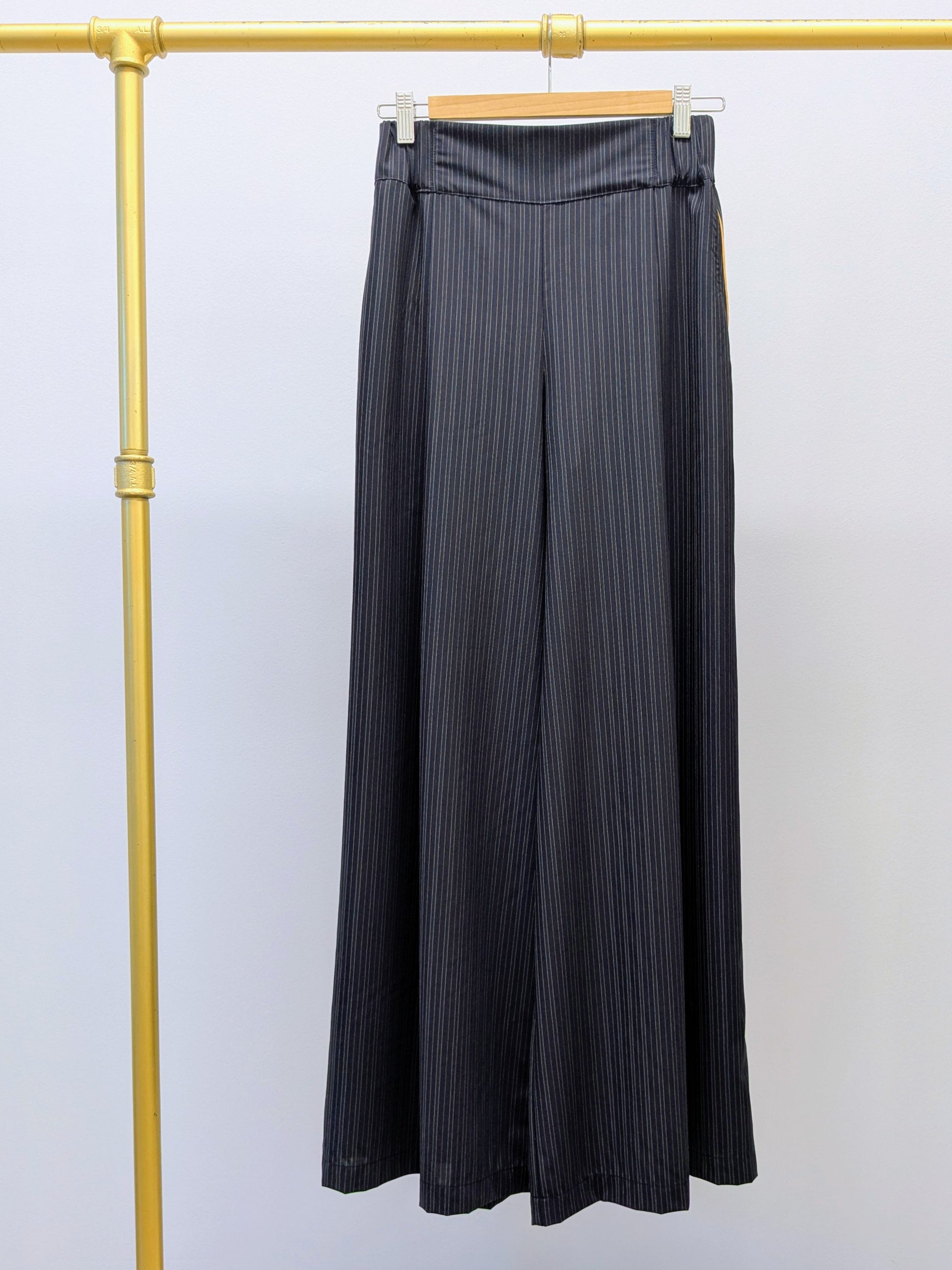 Entdecke die perfekte Mischung aus Stil und Komfort mit unserer Palazzohose in dunkelblauem Nadelstreifen aus feinster Schurwolle!