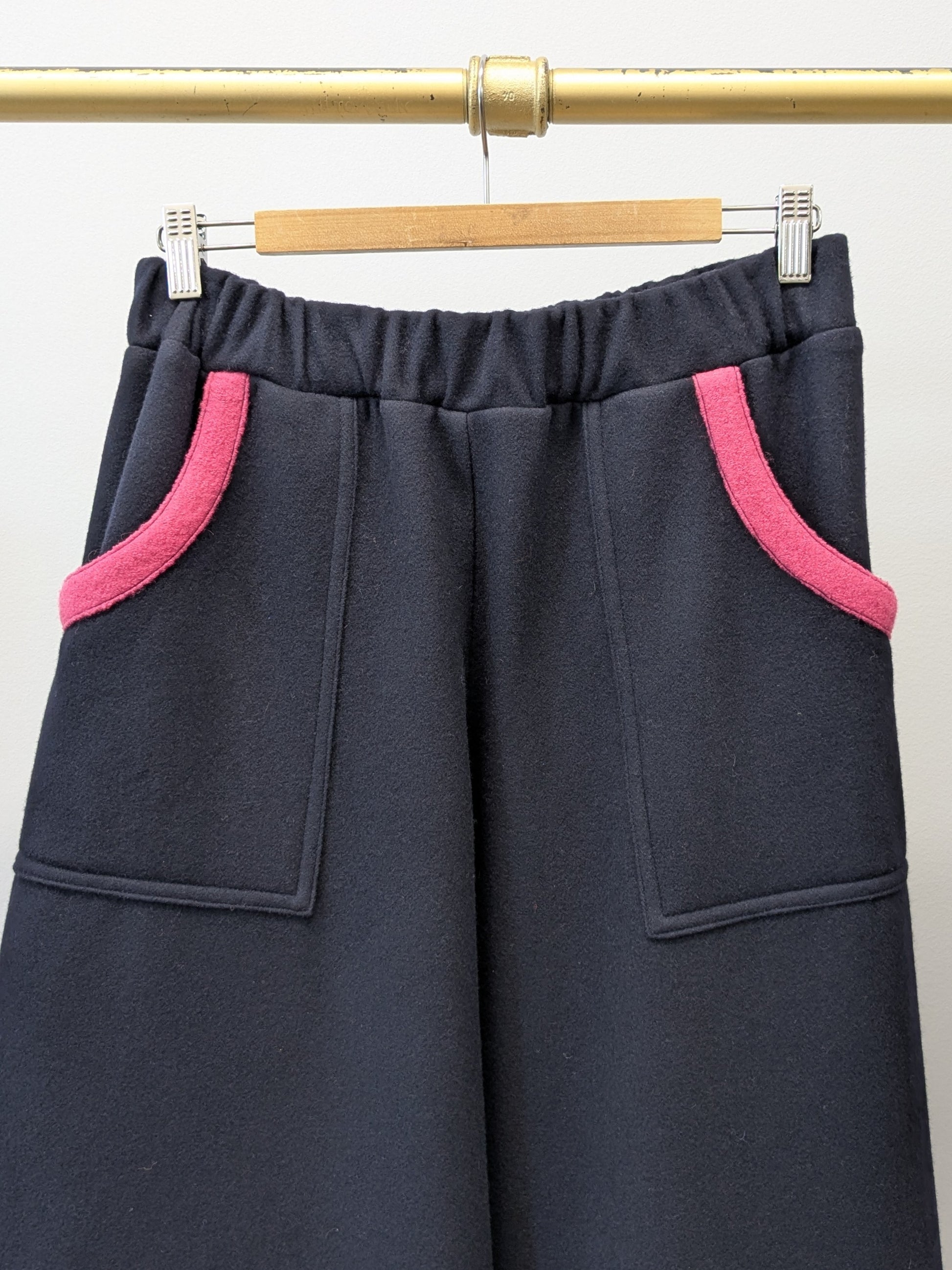 Entdecke die perfekte Mischung aus Stil und Komfort mit dieser zeitlosen Culotte Hose aus einem dunkelblauem geretteten Wollstoff!