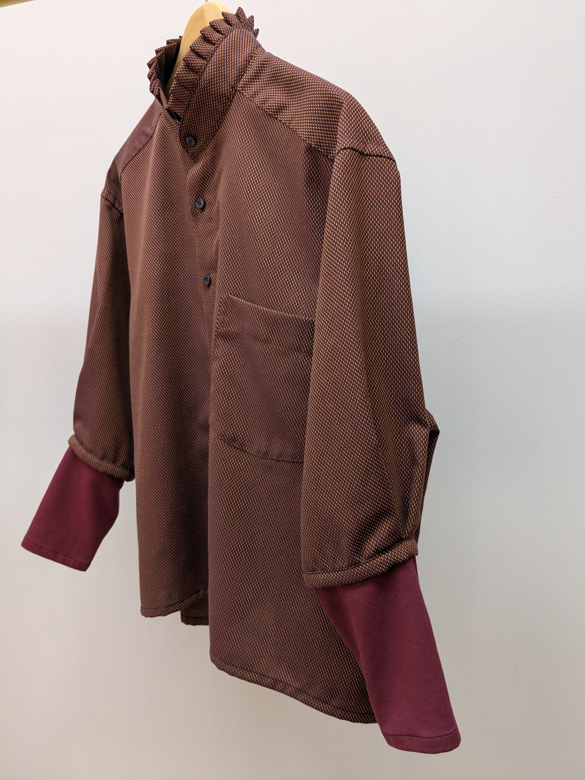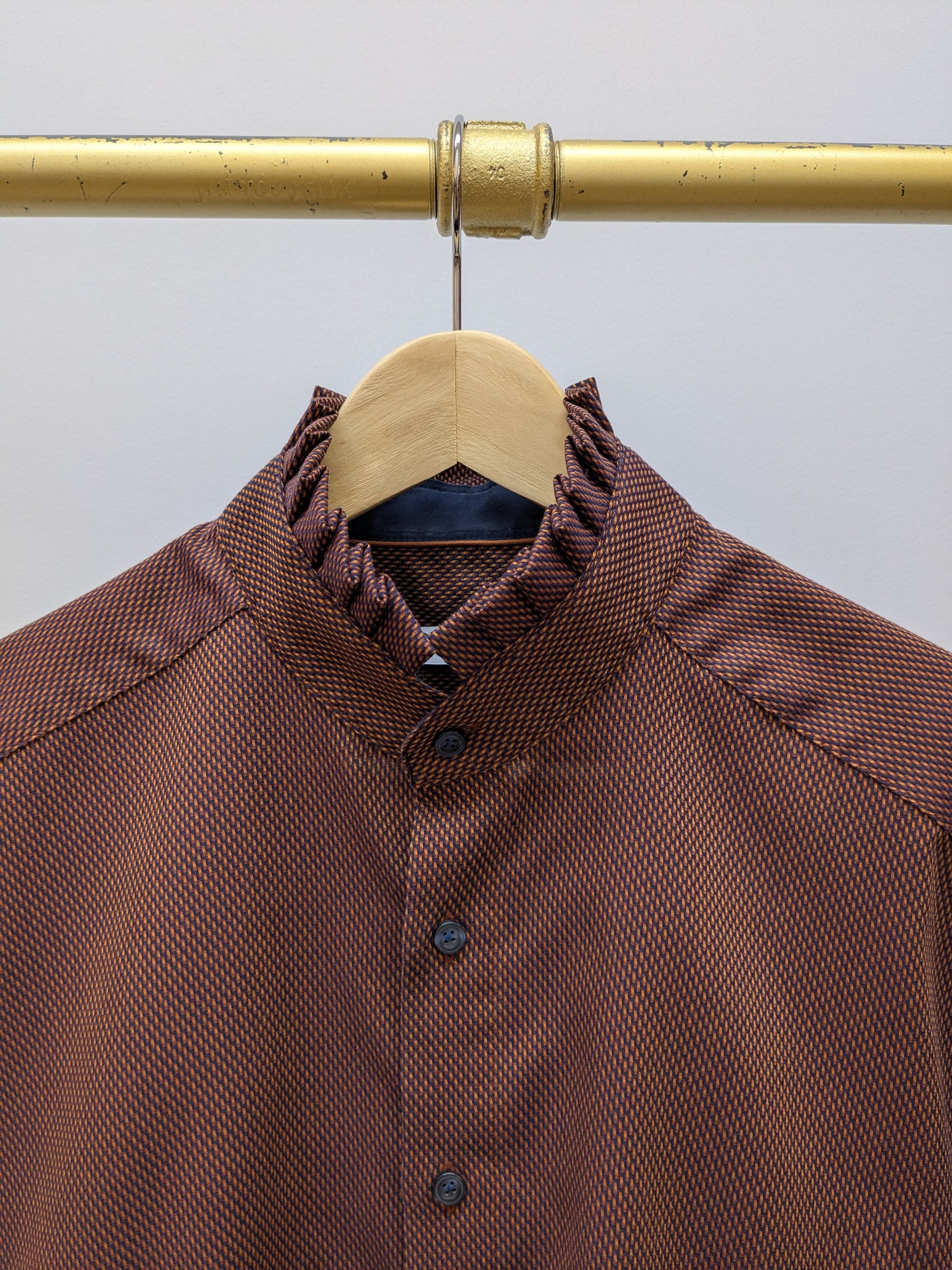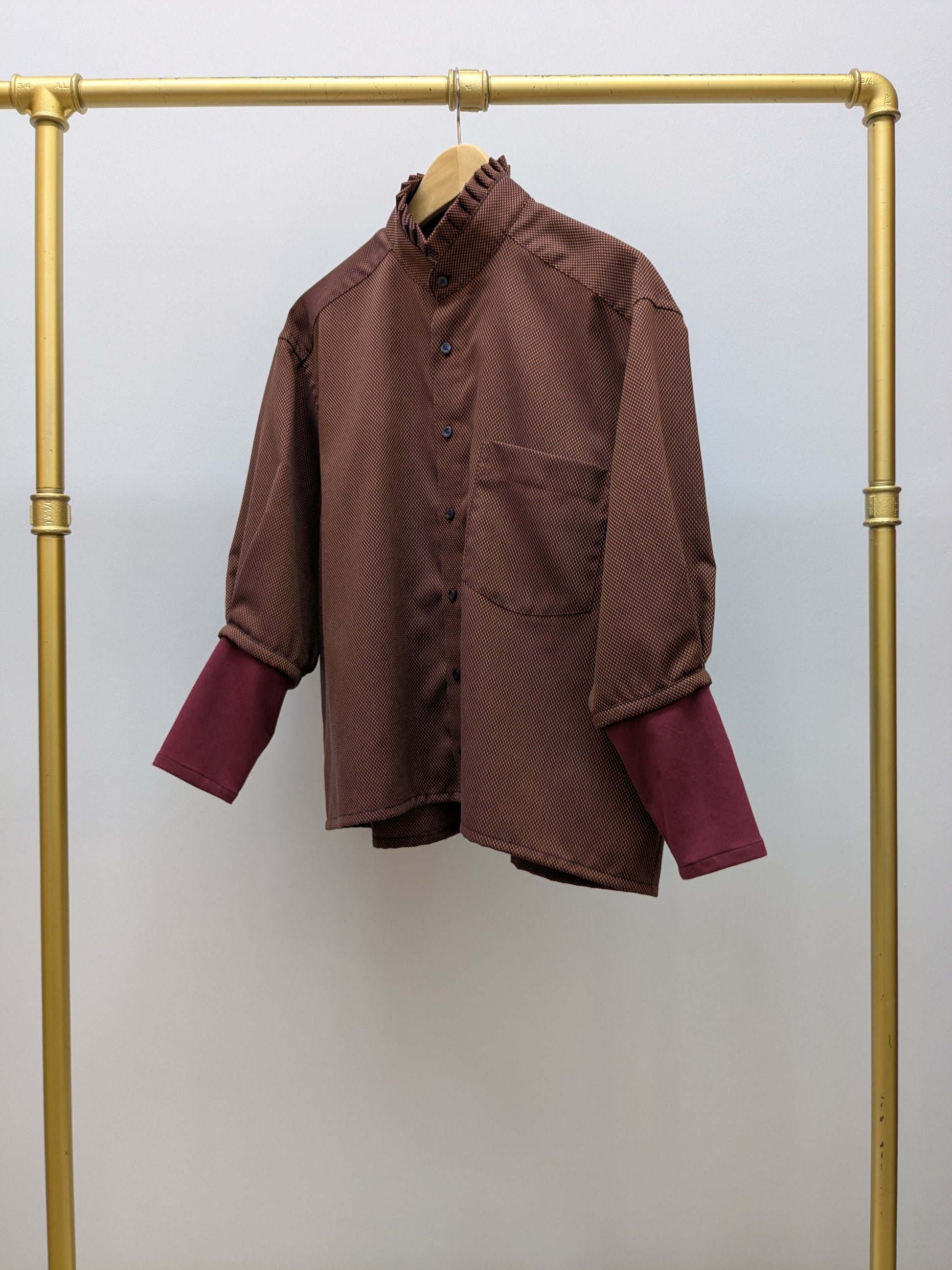 Diese feminine festliche Bluse wurde aus einem geretteten hochwertigem Herrenoberhemd neu interpretiert. Der maskuline Schnitt trifft auf verspielte Details: Ein Rüschenkragen verleiht der Bluse eine romantische Note, während die 3/4-Ärmel mit Kellerfalte und angesetzten Verlängerungen aus weichem Baumwolljersey für Komfort und Leichtigkeit sorgen.