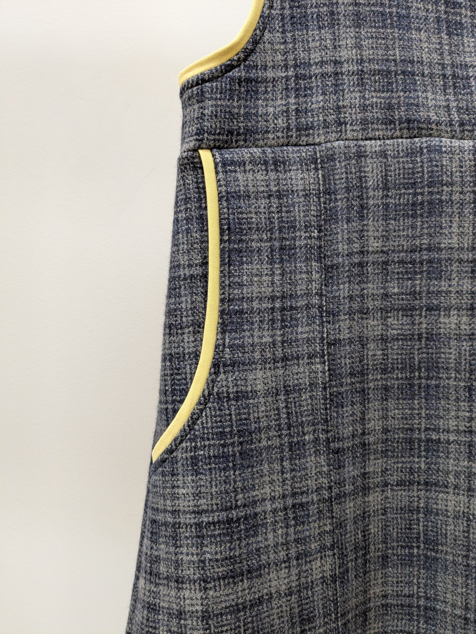 Entdecke unser mit Liebe handgenähtes Trägerkleid aus hochwertigem Deadstock-Wollstoff im klassischen Karomuster. Mit den auffälligen aufgesetzten Taschen bietet dieses ausgestellte Kleid nicht nur ein modisches Statement, sondern auch praktischen Stauraum im Alltag.